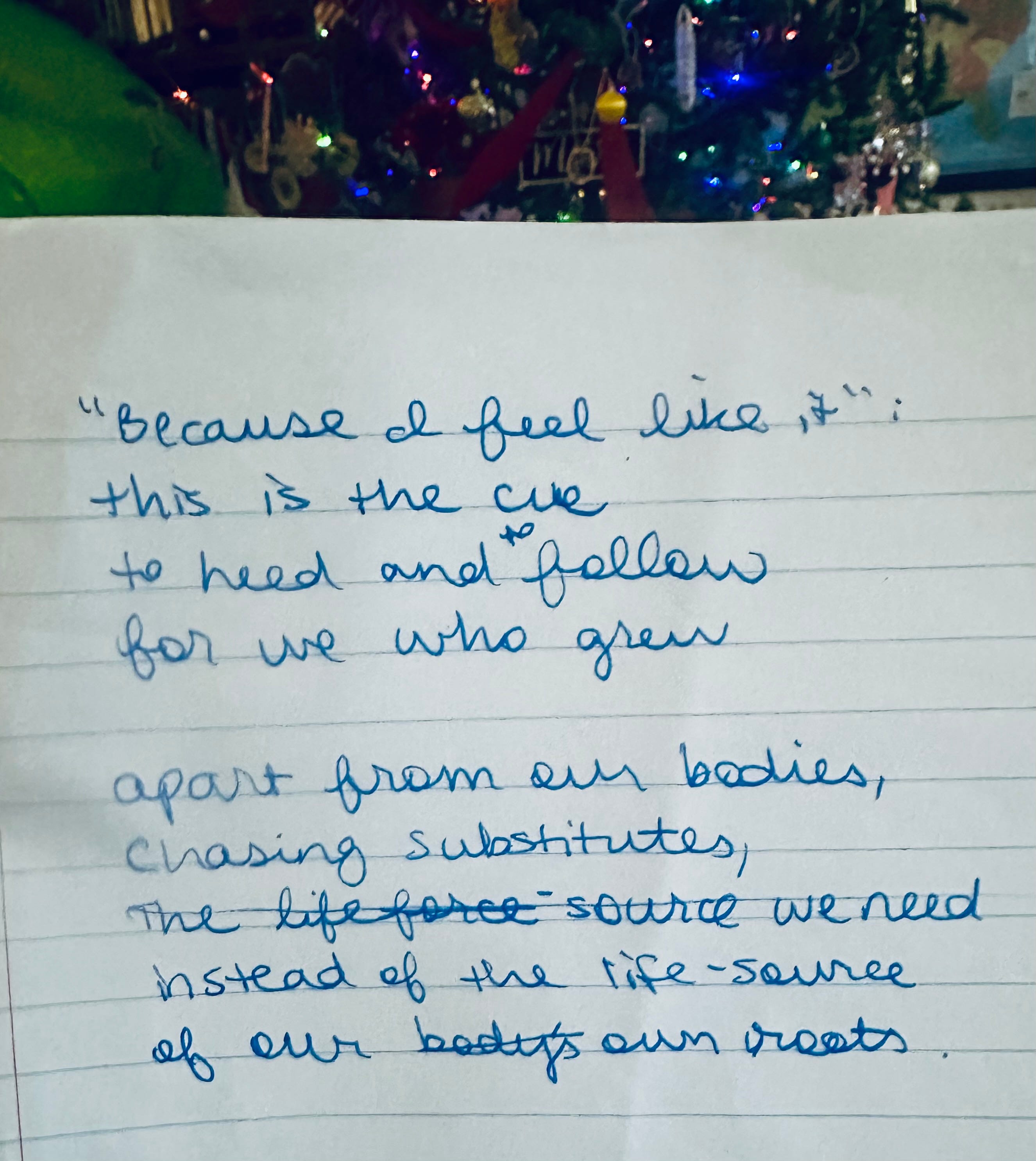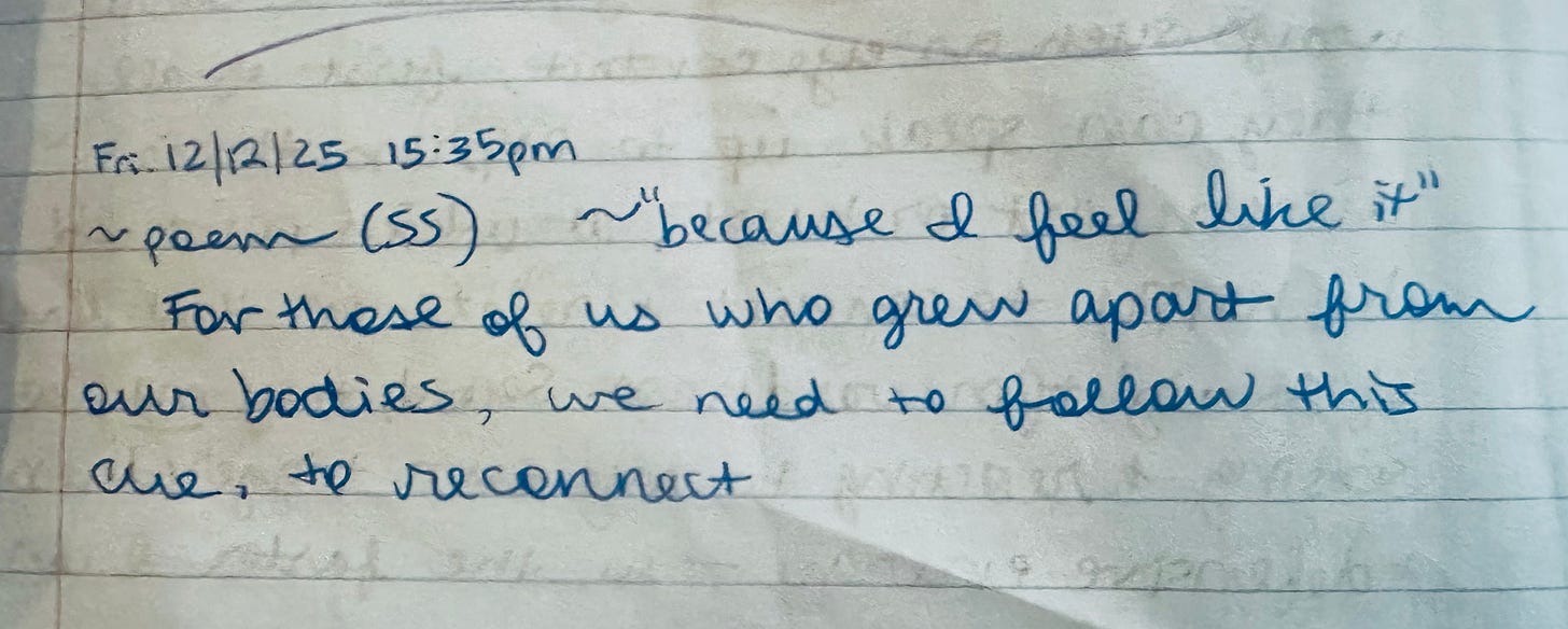 🪷Serenity Splashes🪷"Because I feel like it": this is your cuea learning-poem for me and my friendsAnna EplinDec 12, 2025141ShareArticle voiceover0:00-0:17Audio playback is not supported on your browser. Please upgrade.“Because I feel like it”:this is your cueto heed and to follow,for you who grewapart from your body,chasing substitutes,instead of the life-sourceof your own roots.wintry trees this morningIn the NotebookThanks for reading Whatever the River Brings! Subscribe for free to receive new posts and support my work.SubscribePreviousNext