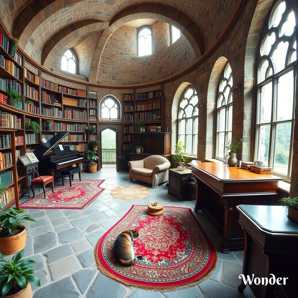 I’ve been creating my own imaginary inner world for almost two decades now, starting when I went to a treatment center for severe depression when I was twenty-two. Prompted by some therapist or exercise there (I can’t recall now), I imagined an inner room for myself that was at the top of a tall tower, safe from the rest of the world. I added a big window with a lovely view, a big desk for writing, walls lined with bookshelves, a piano, a cat, a fountain, and a comfy couch.