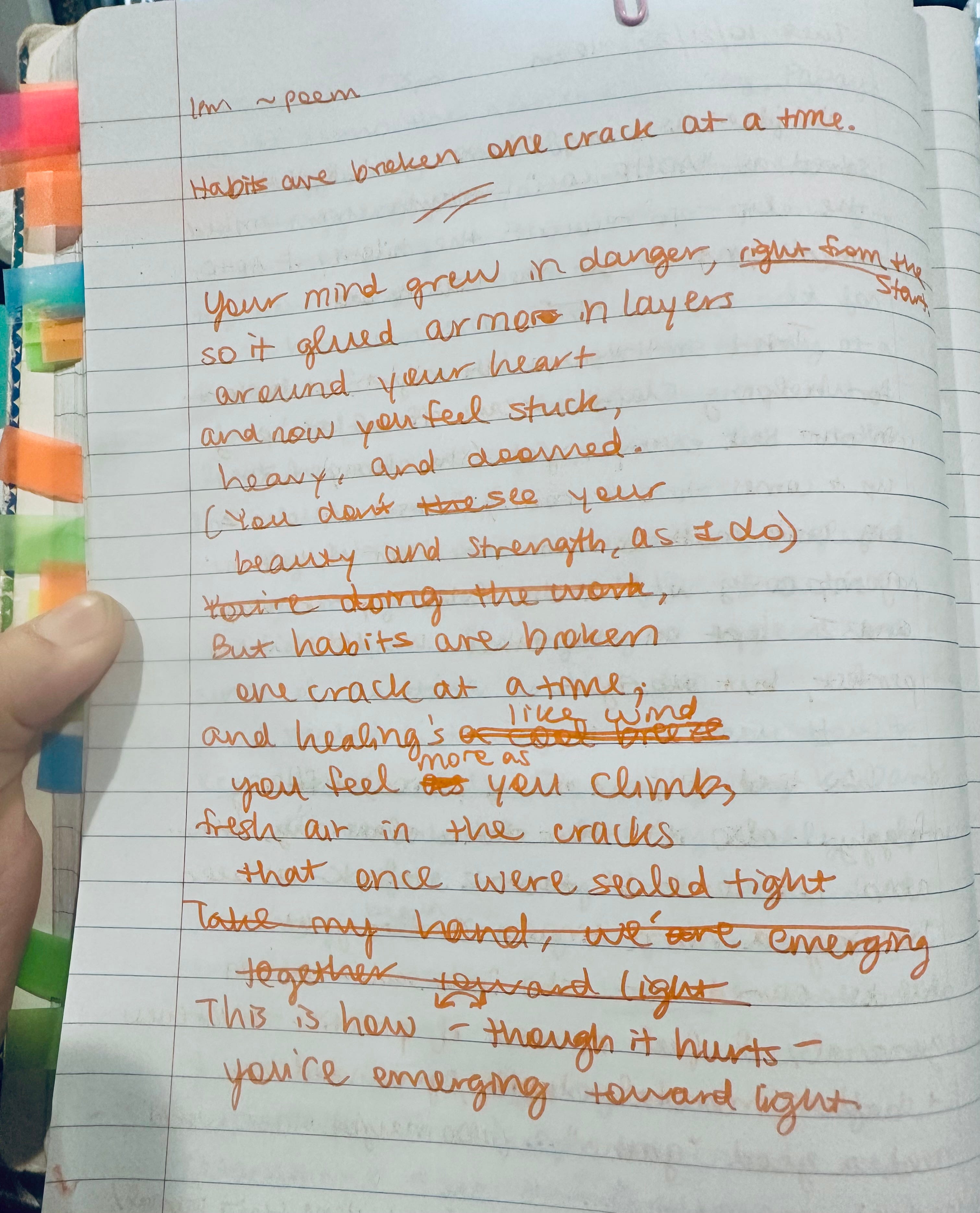 Very wise, hopeful words here. And I'm enjoying seeing how the final poem emerges from your notebook, too!