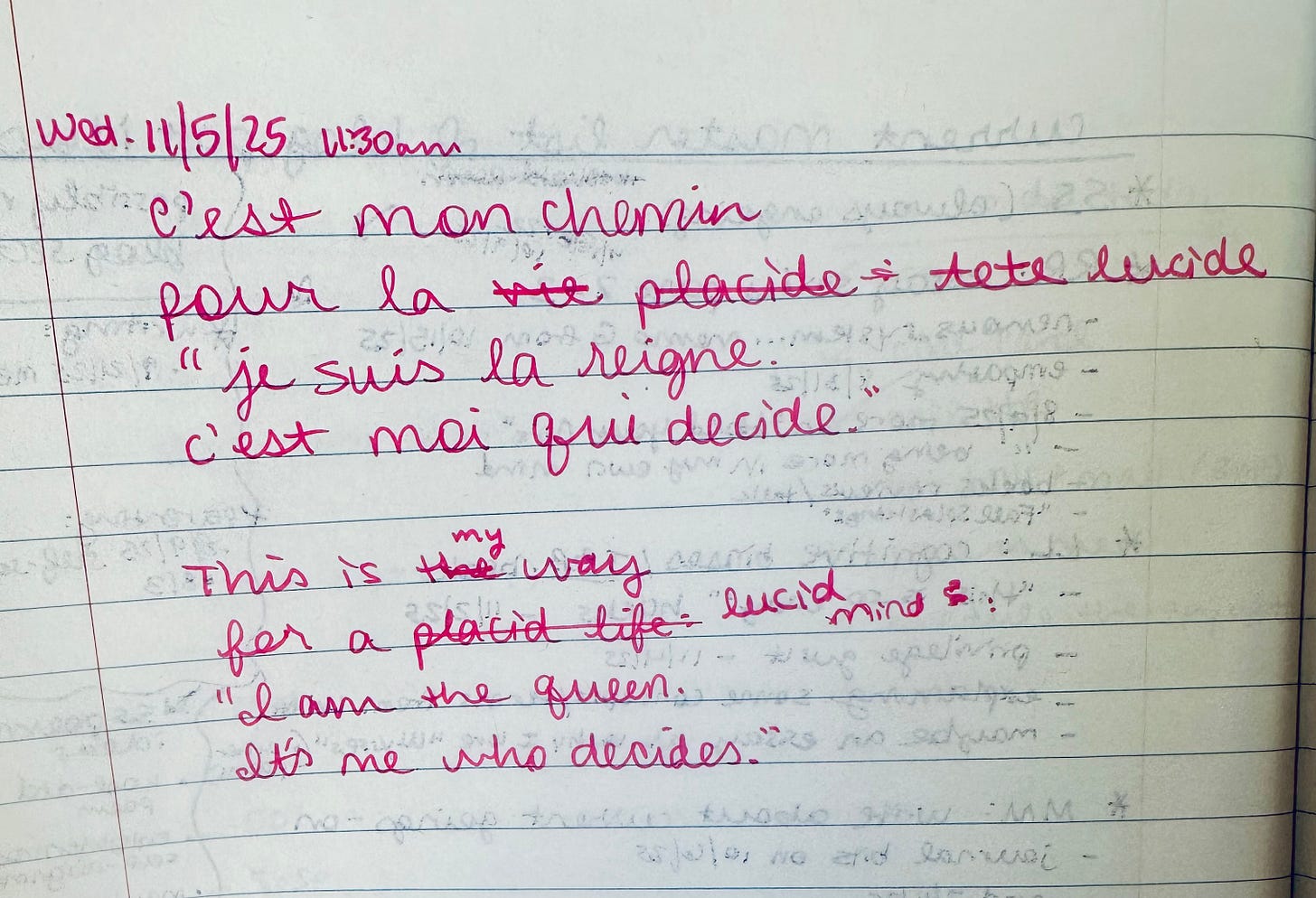 I wrote this in French (which I’ve been learning for a while, mostly via Duolingo) for fun and to help me better remember and access this perspective (because French has such a regal vibe):