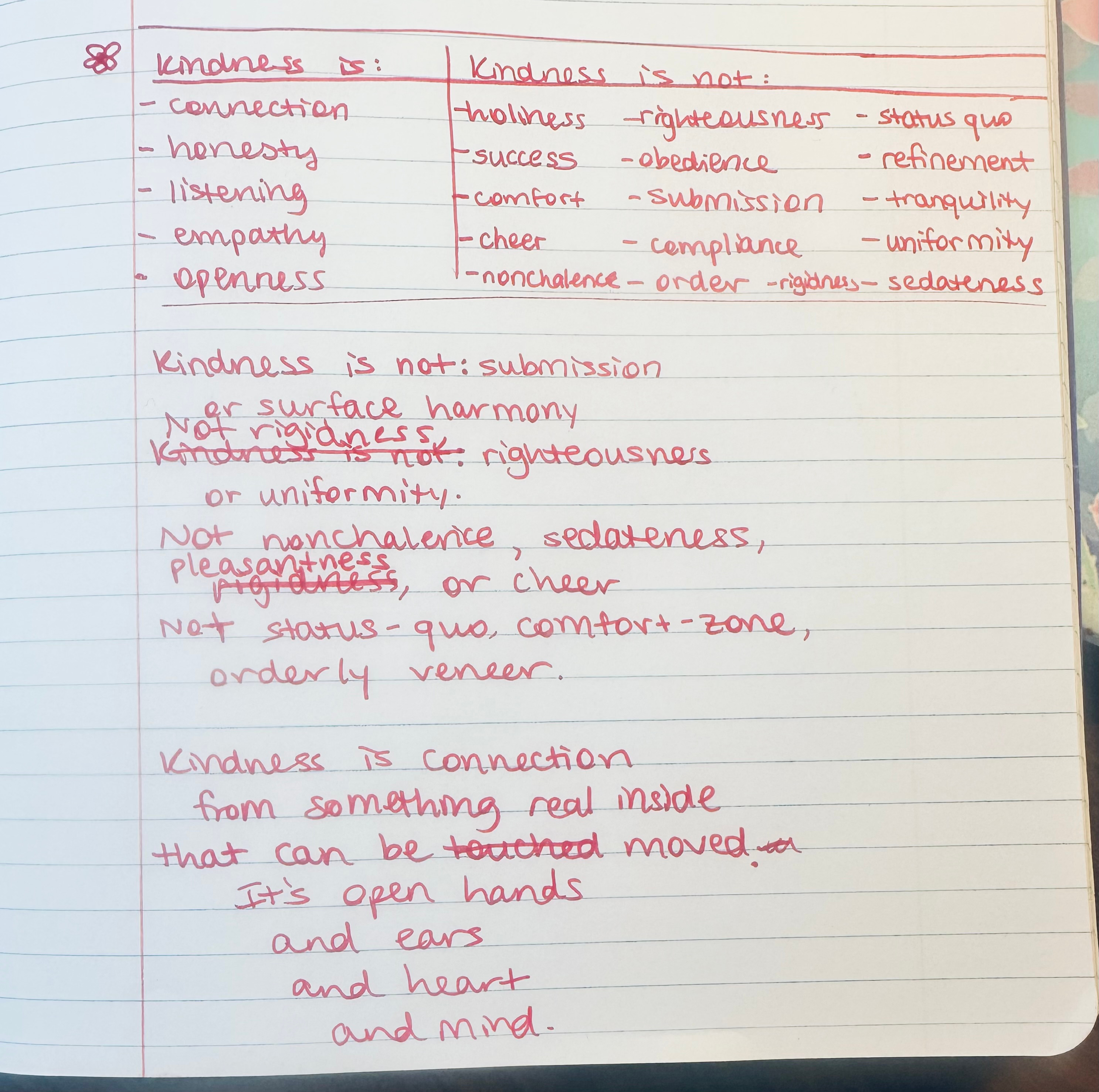 Kindness is not: submission or surface harmony; not rigidness, righteousness, or uniformity; not nonchalance, sedateness, pleasantness, or cheer; not status-quo, comfort-zone, orderly veneer. Kindness is: connection from something real inside that can be moved. It's open hands and ears-- and heart-- and mind.
