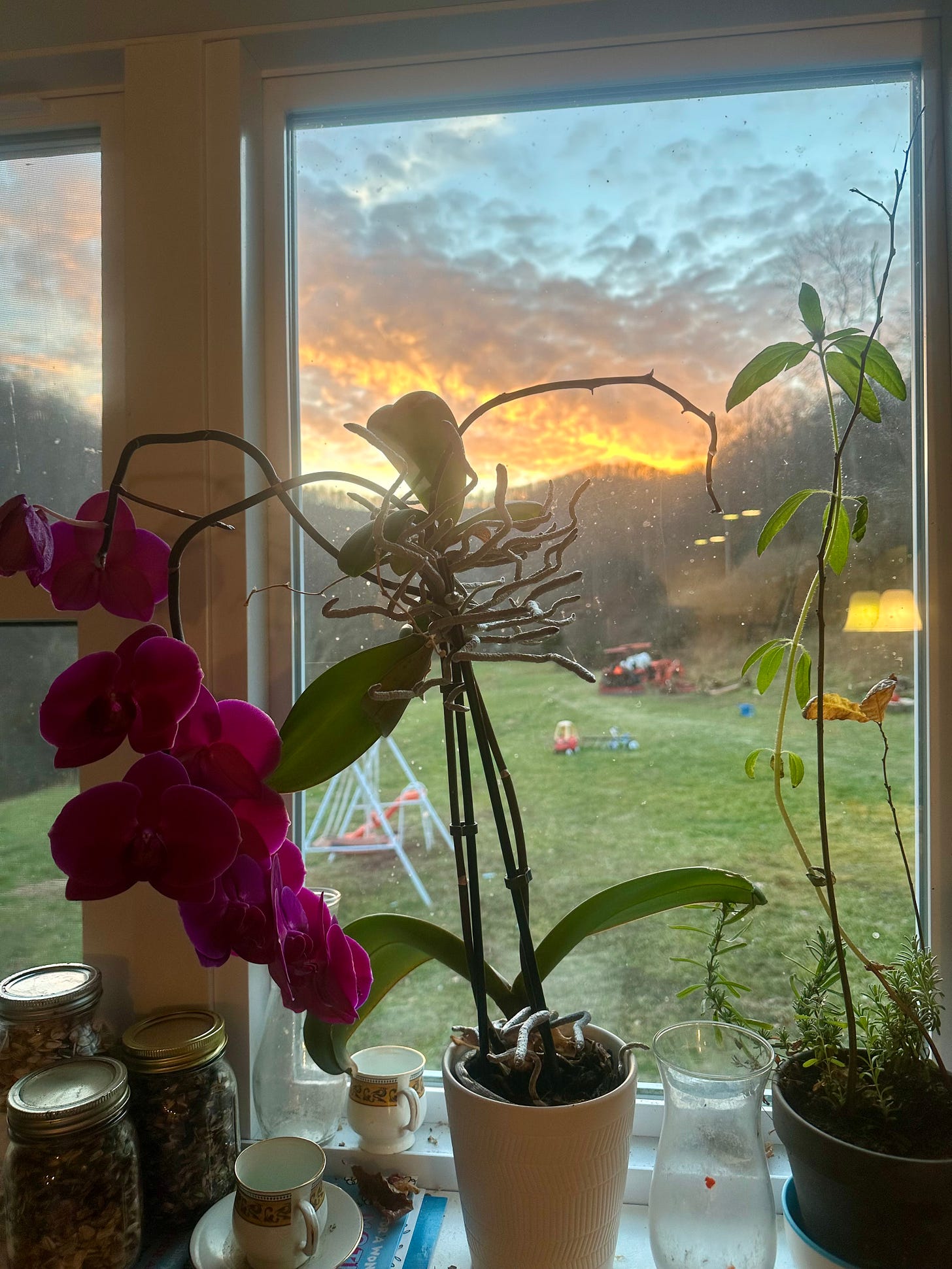 I snapped a picture of this gorgeous sunset through our kitchen window. You can also see our lovely orchid, which is thriving thanks to my green-thumbed husband. (I leave it alone!)