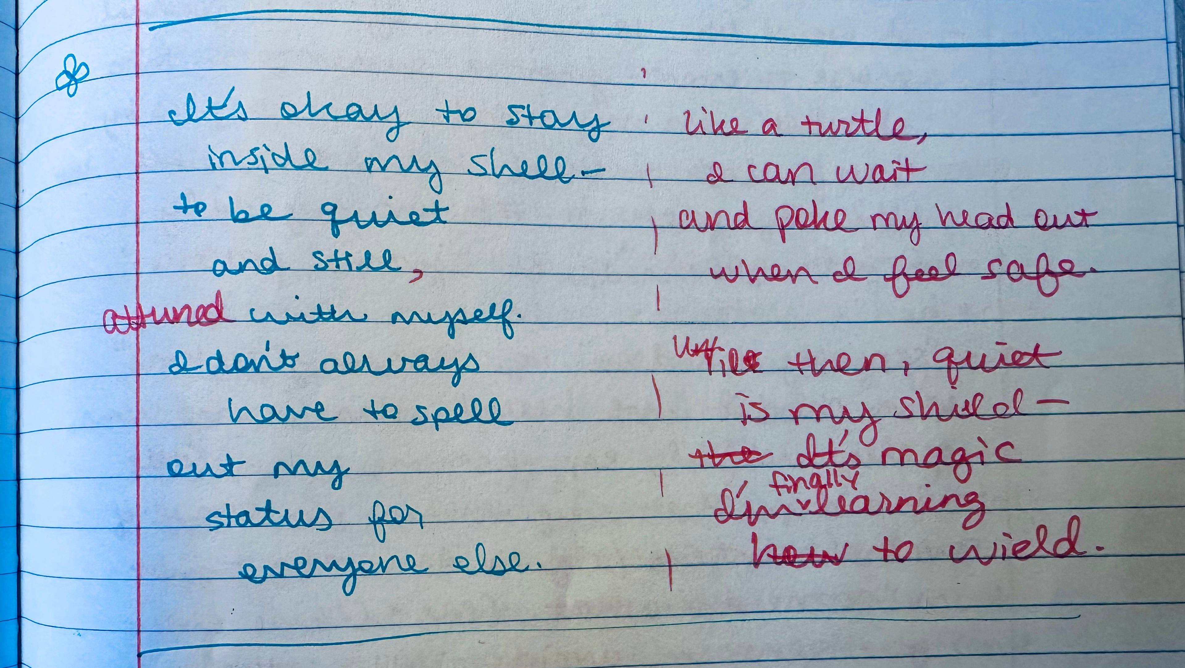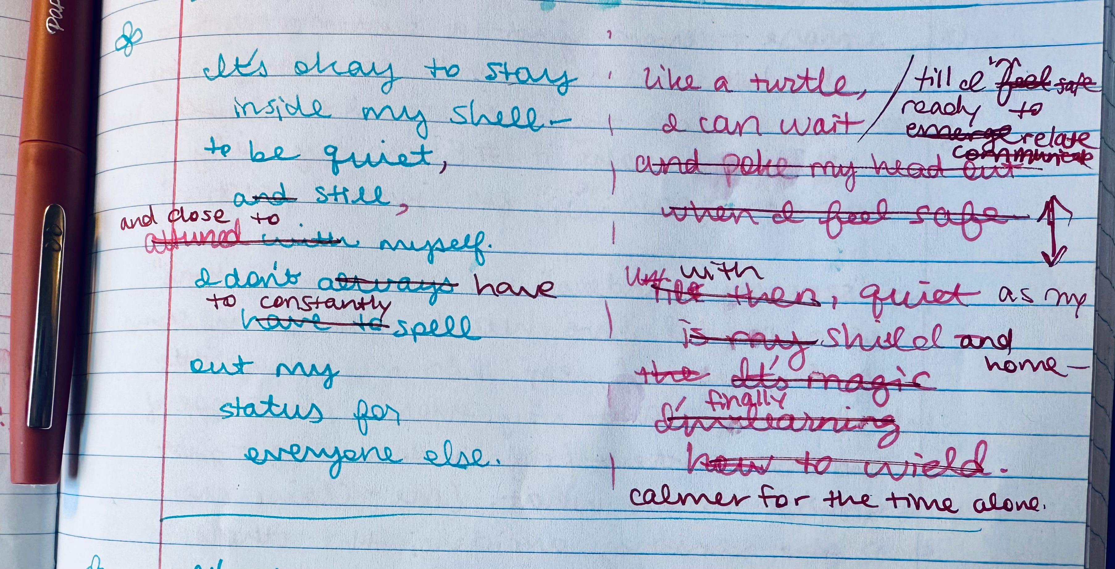 My former therapist (who was awesome--I only stopped seeing her because she left the practice and moved out of state) always used to remind me to "take it turtle slow," so I can definitely relate to the metaphor here! And I love seeing your revision process, as I've got some *rough* attempts from this month that need some work. ✨🐢