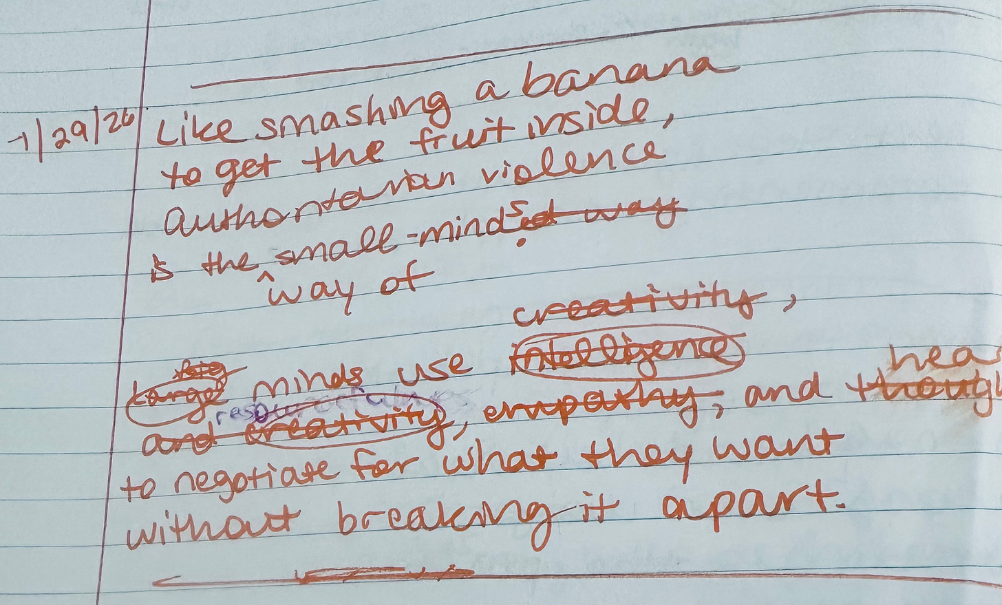 🪷Serenity Splashes🪷Violence vs. Intelligencefurther reflections on authoritarianismAnna EplinJan 29, 2026311ShareArticle voiceover0:00-0:17Audio playback is not supported on your browser. Please upgrade.Like smashing a bananato get the fruit inside,authoritarian violenceis the way of small minds.Large minds use intelligence,resourcefulness, and heartto negotiate for what they wantwithout tearing it apart.icicles from the recent winter stormIn the notebook Thanks for reading Whatever the River Brings! Subscribe for free to receive new posts and support my work.SubscribePreviousNext