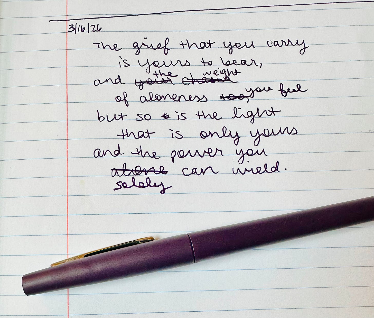 The grief that you carry is yours to bear-- and the ache of aloneness you feel-- but so is the light that is only yours and the power you solely can wield.