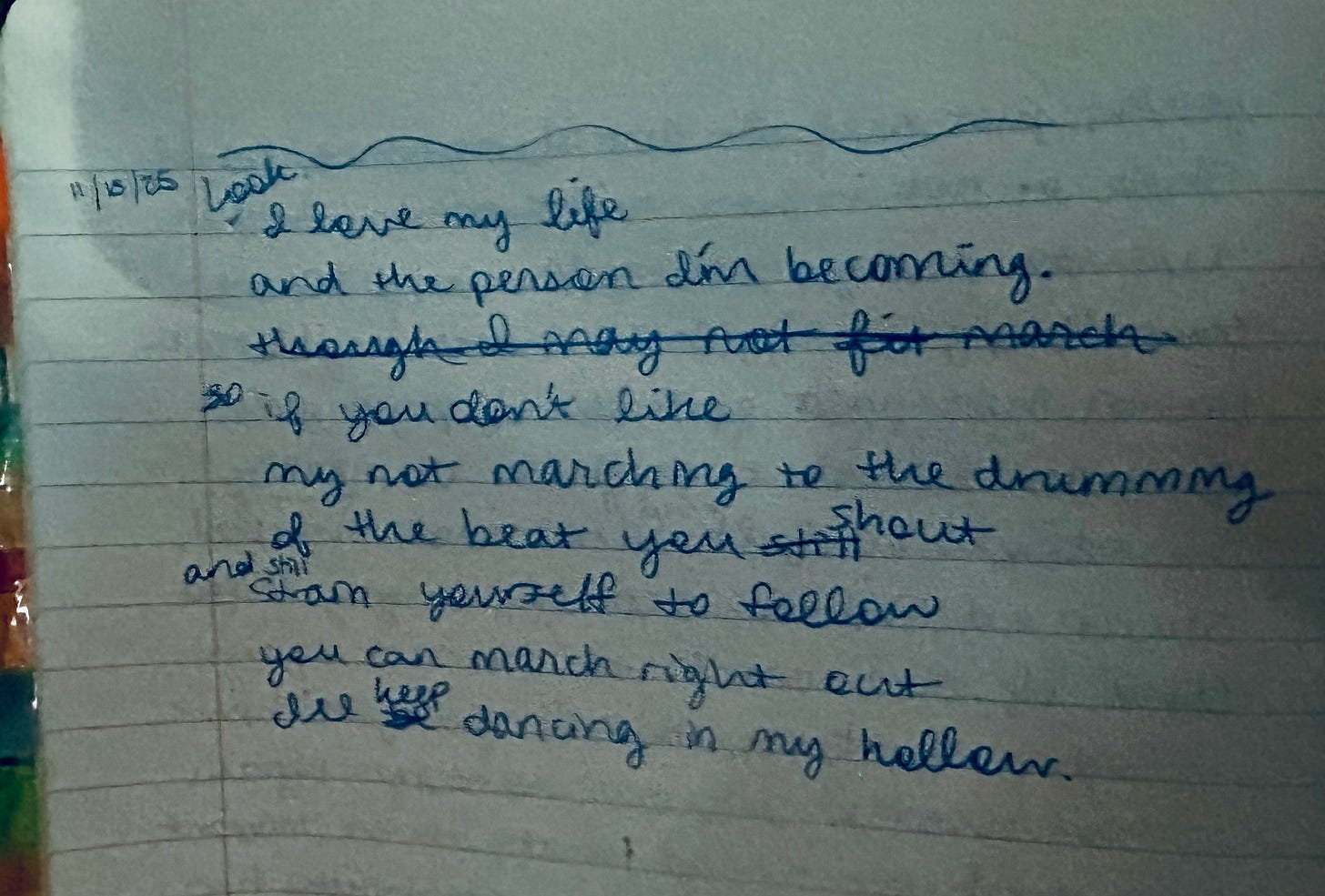 Look, I love my life and the person I’m becoming— so if you don’t like my not marching to the drumming of the beat you shout and still strain yourself to follow, you can march right out. I’ll keep dancing in my hollow.